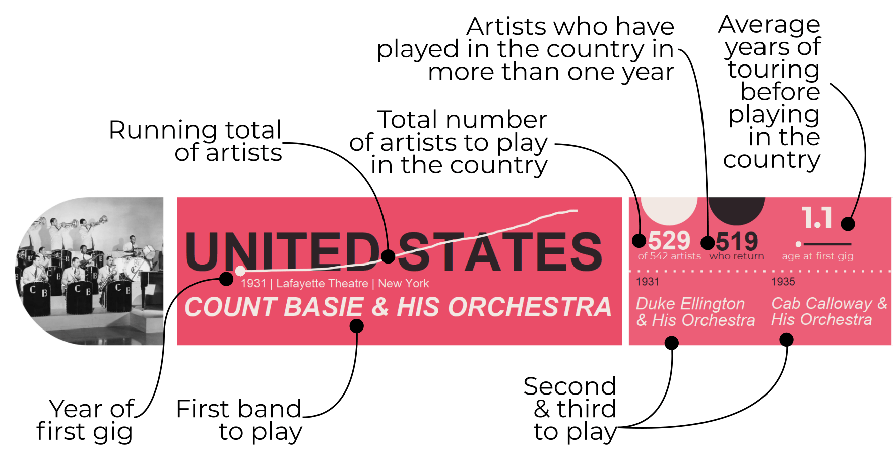 To give you a sense of the artists I’ve looked at, here are the ones who’ve visited the most countries by year.